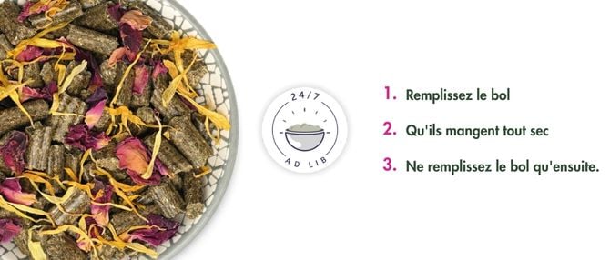 | Directives d'alimentation | RabbitDream SpecialEdition BLOSSOMS est entièrement équilibré. Il peut être proposé en libre disposition (ad lib). Cela signifie : remplissez le bol et ne le remplissez qu'une fois vide. Les animaux ne couvriront que leurs besoins.Complétez avec de l’eau fraîche et tiède et du foin bunnyNature de haute qualité. Cela garantit une nutrition optimale 24h/24 et 7j/7, sans dosage, rationnement ni restriction. L'alimentation devient facile ! Conserver dans un endroit sec. |