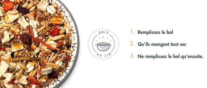 Ce mélange peut être nourri à volonté – grâce à sa recette équilibrée, permettant à l’animal de se détendre et d’éviter le stress de nourriture qui viendrait à manquer.