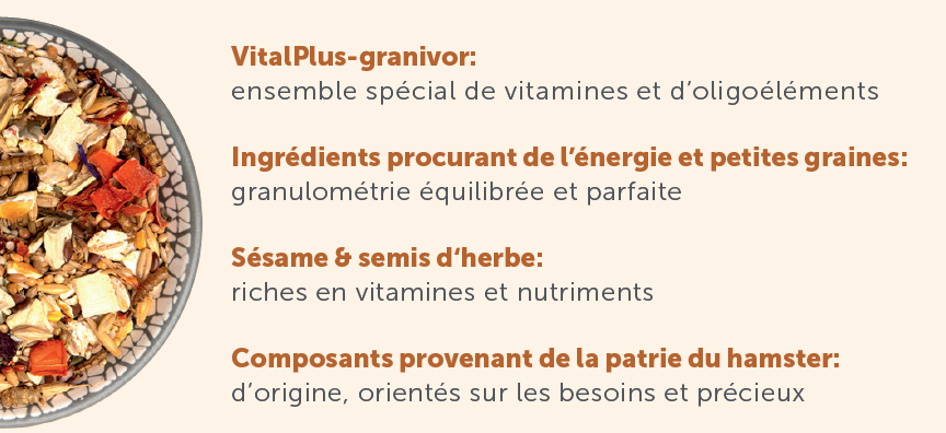 Nous connaissons très bien les hamsters. Il y a des hamsters qui aiment manger des granulés et des extrudats, et il y a ceux qui les trient soigneusement dans leur bol. Ces derniers manquent alors de nutriments importants comme les vitamines et les oligo-éléments. C’est pourquoi nous avons pensé à une formule « VitalPlus-granivore », un mélange spécial de vitamines et d'oligo-éléments permettant de se passer de granulés et d'extrudés dans les produits EXPERT. Une acceptance à 100% garantie et sans gaspillage !