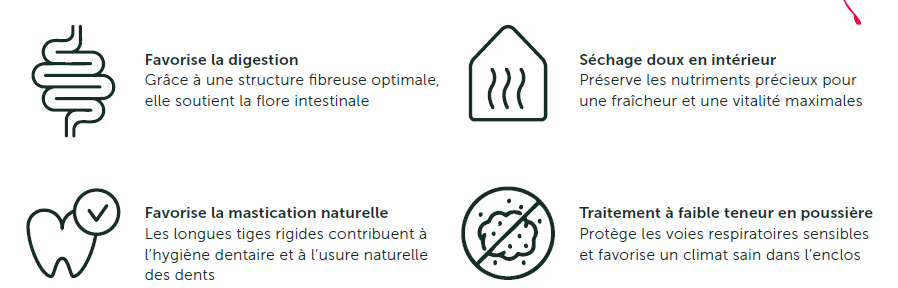 Foin Timothy d’Allemagne, emballé à la main pour ne pas casser la longueur des fibres.